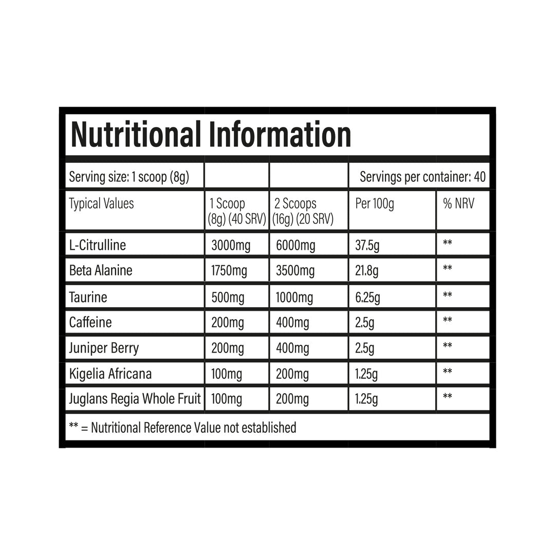 We've also included the usual suspects in Beta Alanine, Taurine, L-Citrulline and Caffeine. A fully transparent formula containing 7 of the finest and most high quality ingredients, working in synergy together to bring you a powerhouse of a pre-workout