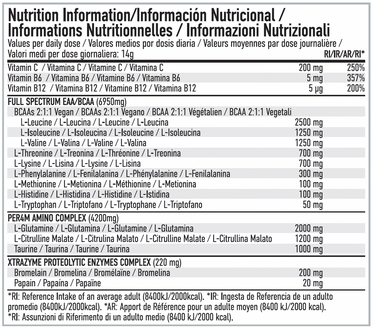 To complete a truly rounded formula EAA XTRA also features precise doses of Taurine for hydration, Vitamin C for immune support and Citrulline Malate for ammonia removal helping you train harder and recover faster from hard hitting training sessions.