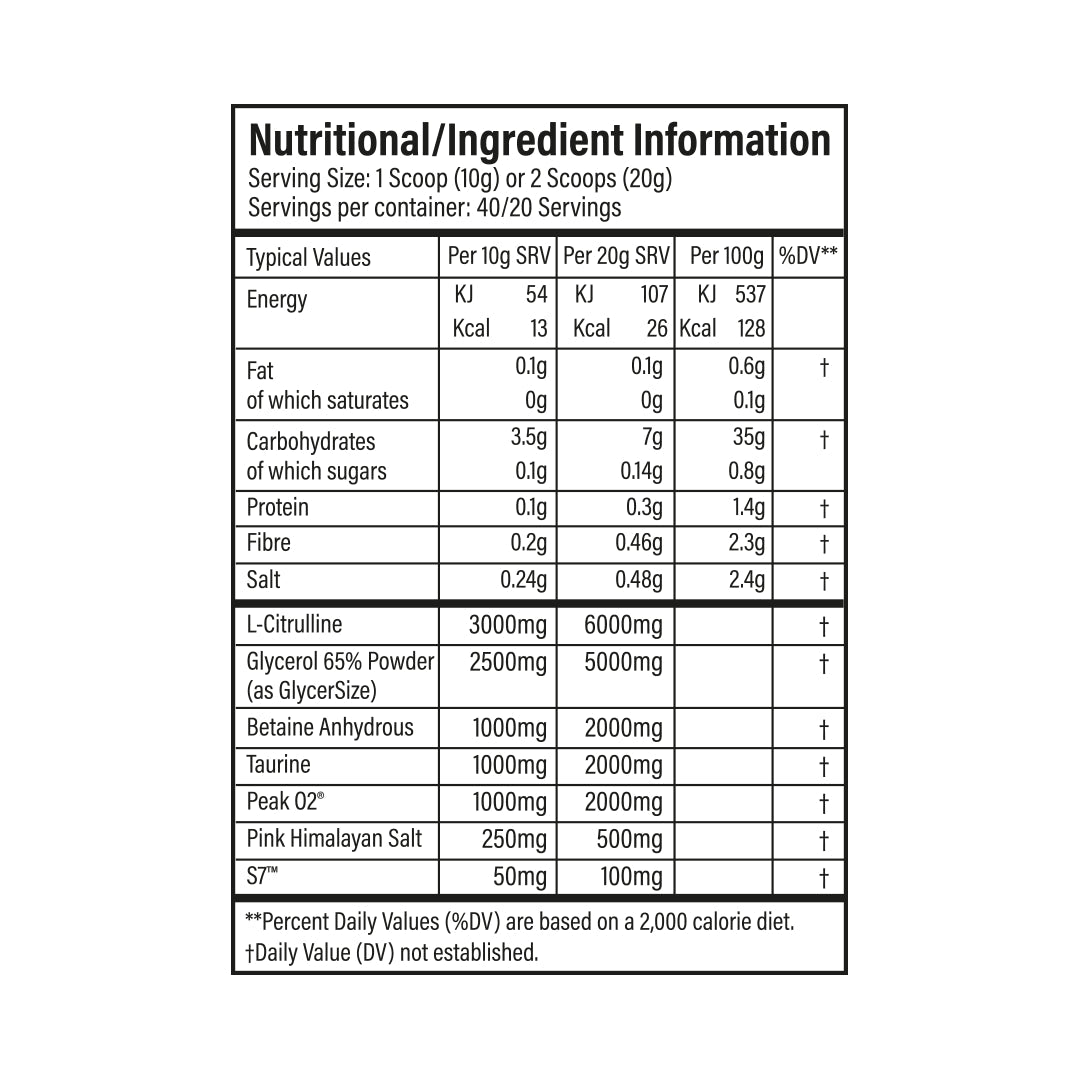 S7 is a blend of 7 plant based ingredients that increase nitric oxide. This, alongside Himalayan pink salt, further attributes to the overall 'pump'.
