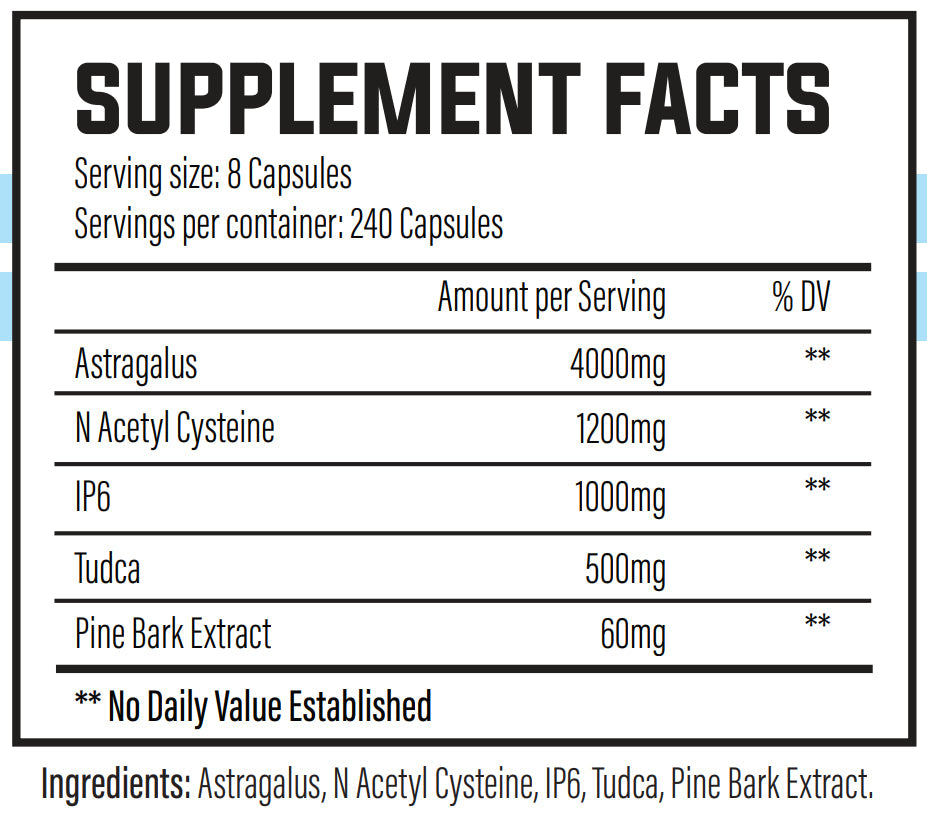 N Acetyl Cysteine and Pine Bark helps with detoxification and reducing inflammation.
