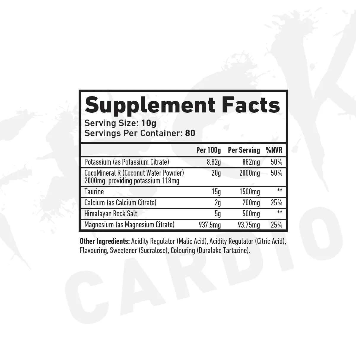 A combination of Cocomineral, Taurine, Himalayan pink salt and an electrolyte blend to replenish what you lose through sweat, commonly throughout the day and especially during workouts.